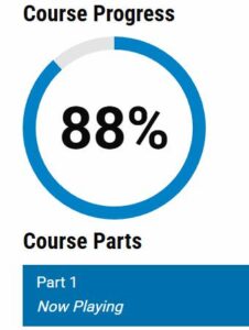 To receive CLE credit and your Certificate of Completion for a self study program, you must watch the entire program from start to finish and complete the required evaluation at the end. Please check the “course progress” icon on the course page to track your progress. The progress circle will show the percentage of the program you have completed and will show “now playing” in the “course parts” progress bar. For example: