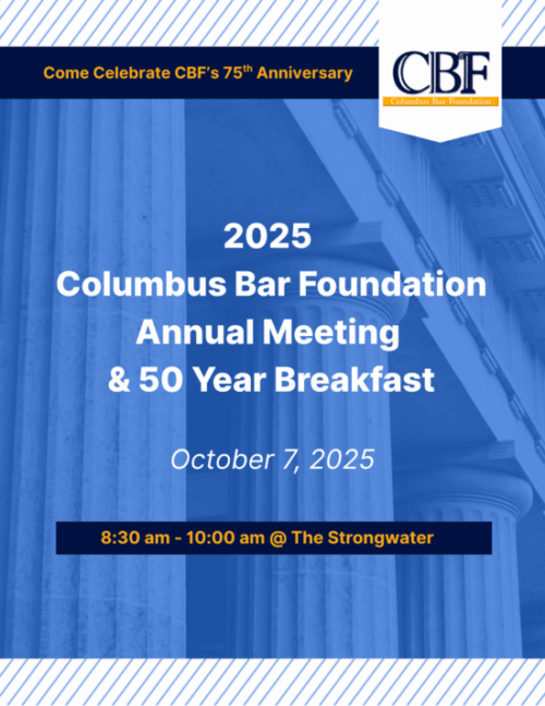 Join us as we mark a major milestone, 75 years of service to the Central Ohio legal community! The Columbus Bar Foundation Annual Meeting is your chance to reflect on our impact, connect with like-minded legal professionals, and look ahead to the future of our Foundation.