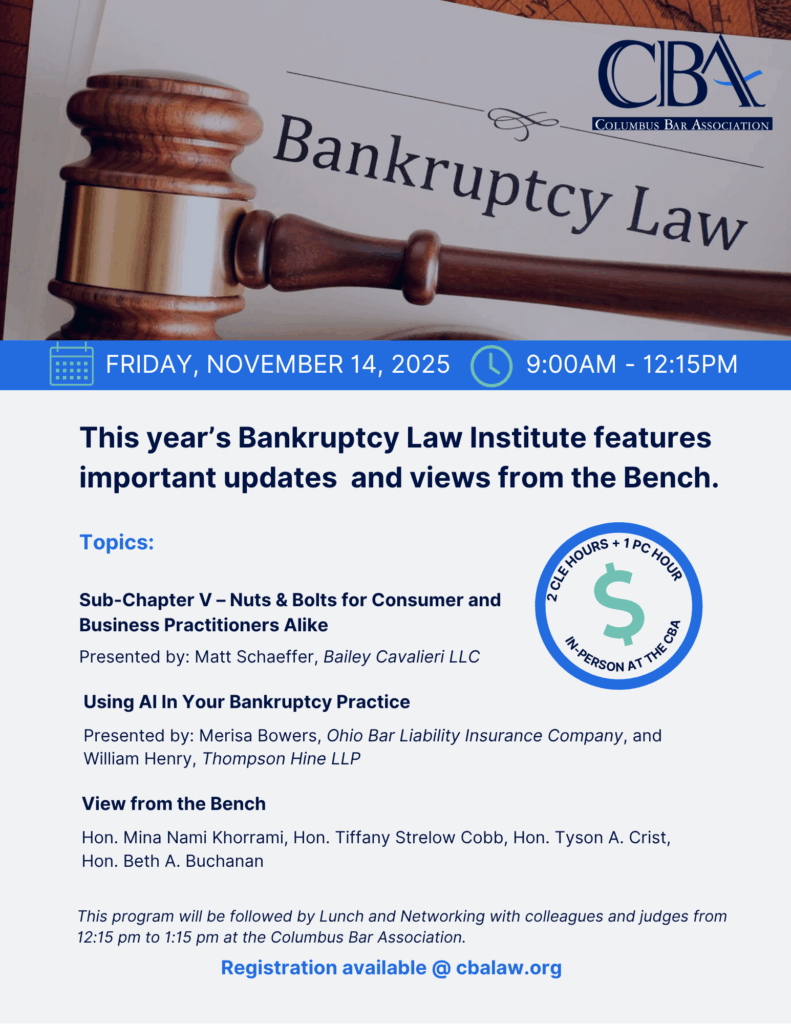 Bankruptcy law continues to evolve — and staying informed is key to protecting both your clients and your practice. The Columbus Bar Association’s Bankruptcy Law Institute, held Friday, November 14, 2025, from 9:00 AM to 12:15 PM, delivers the updates and perspectives you need, directly from the experts and the bench.
